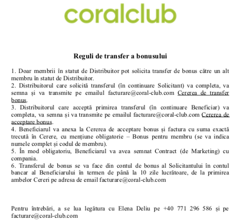 2. Poti solicita plata bonusului în contul bancar pe baza unei facturi emise cātre CoralClub pentru serviciile de marketing prin recomandare pe care le realizezi pe parcursul unei luni calendaristice. Pentru aceasta este nevoie sā detii o firma sau sā fii Persoana Fizica Autorizata si sā fie semnat un contract de marketing între CoralClub si firma ta/ PFA.